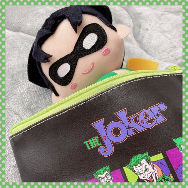 初めてのお出かけ、割と大きいぬいちゃんなので入るサイズのポーチあるかな~…と前日夜にガサゴソしてたんですが、まさかのジョーカーポーチがジャストフィット!